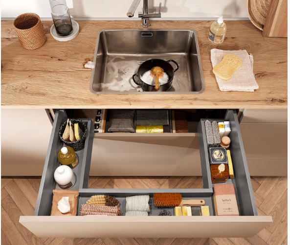 It’s very useful to have storage space around your sink. This sink cabinet uses every inch of storage space available and gives you easy access to contents. It keeps worktops free and ensures that washing-up items are immediately to hand. The cabinet can be implemented with standard LEGRABOX and TANDEMBOX components.