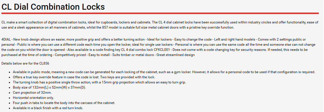 Carbine Australia Locker Lock Mechanical Combination - key Override, Removable Cylinder
