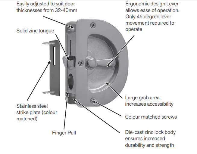 PRIVACY LATCH The POLARIS cavity Privacy Latch is suitable for applications such as bedrooms and bathrooms where privacy is the desired function. Contains one latching lever and one emergency egress coin turn.