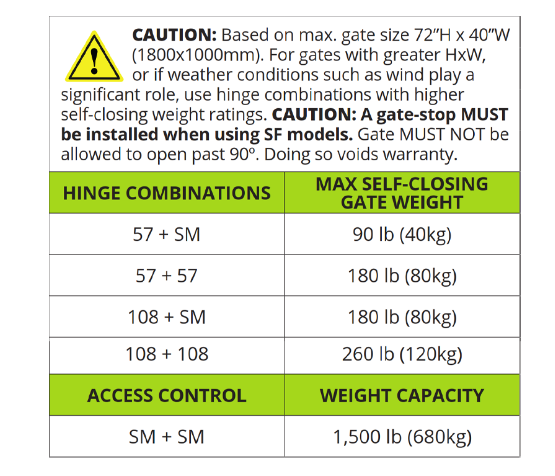 - Self-Closing Gate Weight: Up to 80kg (180lbs) in combination with hinge (refer chart)