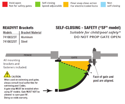 - Self-closes gates up to 120kg (260lb) – See Chart