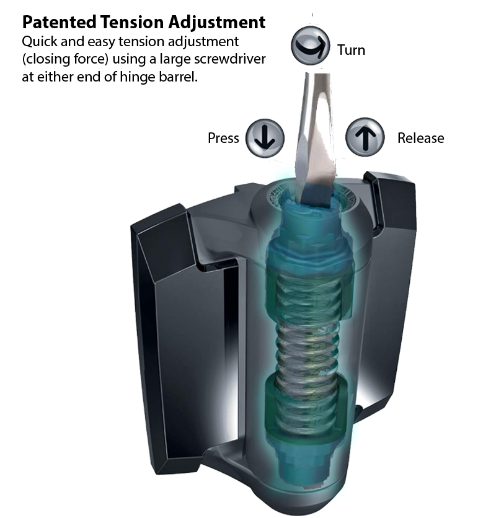 D&D TRUCLOSE® REGULAR Hinges are quick and easy to install and to adjust for self-closing speed. They come standard with Black trim covers, which means there are no visible fasteners. Optional Polished or Chrome metallic trim covers are also available. The TruClose® REGULAR hinges come in a range of other options, including models with side-fixing legs (to assist speedy installation and extra fixing strength) and a MiniMulti version offering 3-way adjustment (vertical, horizontal and tension adjustment) in square- and round-post versions.