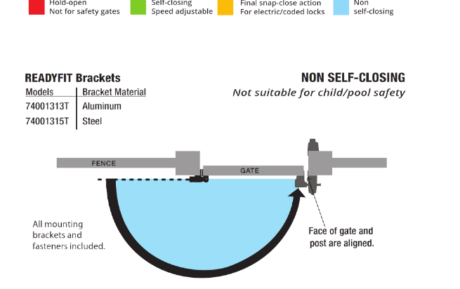 - Self-Closing Gate Weight: Up to 120kg (260lbs) in combination with hinge (refer chart)