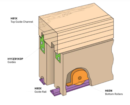 The Henderson H113/81X guides are used in conjunction with the Henderson H81X channel for the Henderson Loretto sliding door track system. Each pack consists of two guides.