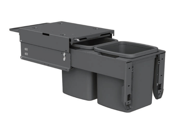 Active Lid system helps to control odours. Hidden from sight at the top of the bin inside the cabinet, the Active Lid drops down to close over the buckets when the unit is closed.