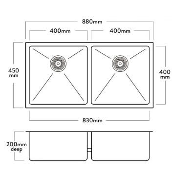 Bowl size                  : 400 x 400 x 200 + 400 x 400 x 200mm with 30mm bridge