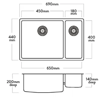 The Pressato PR220R Bowl & 1/4 sink has a 15mm corner radius and comes standard with two 90mm round basket wastes, sound deadening pads and 15l/m overflows.