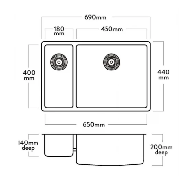 Bowl size R : 450 x 400 x 200mm + 180 x 400 x 140mm