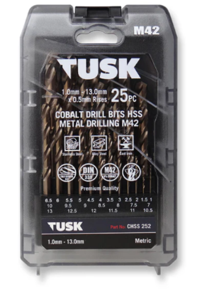 TUSK Cobalt HSS Metal Drill Bits are fully ground bits constructed of M42 High Speed Steel for the maximum combination of strength, heat & wear resistance and bit life at higher cutting temperatures and are the preferred drill for harder materials especially stainless steel. 8% cobalt HSS provides 5x more life than regular TIN coated HSS drills. Increased 135 degree point enables a faster drilling rate, lower feed pressure and features a 'split point' or 'self centering' tip.