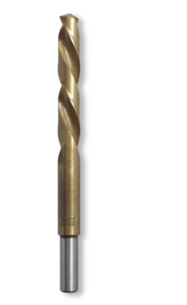HSS Fully ground drill bit. M2 High Speed Steel for strength, heat & wear resistance. Titanium Nitride (TiN) coasting for longer life. Increased 135 degree point enabling faster drilling rate & lower feed pressure. Shank reduced to fit 13mm chucks. Features 'split point' or 'self centring' tip.