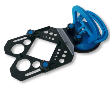 Suction cup can also be detached and used separately as a tool to hold and carry tiles. The drilling template is compatible with any WET or DRY diamond drill bits and feature seperate pre-drilled guide holes designed for entering diamond tipped drill bits from 4mm - 120 dia. Two hose connection nipples have been built-in for water cooling if wet drilling.