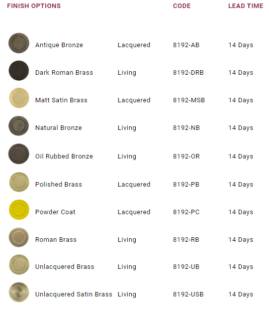 Antique Bronze, Dark Roman Brass, Matt Satin Brass, Natural Bronze, Oil Rubbed Bronze ,Polished Brass ,Powder coat ,Roman Brass ,Unlacquered Brass ,Unlacquered Satin Brass